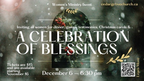 The Christmas season will be here before you know it, so mark your calendars for December 6 at 6:30 pm and get ready for some Christmas fun with the women of Cedar Grove! Invite a friend or two and join us for an extra special night that includes dinner, testimonies, Christmas carols, and blessings - all mixed together with fun and games that will allow us to connect, laugh, and leave blessed.