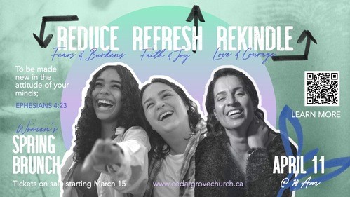 Calling all ladies aged 16 to 99: Get ready to Reduce your fears & burdens, Refresh your faith & joy, and Rekindle your love & courage! Join us at our spring brunch and and enjoy great food, conversation, worship, speakers and perhaps meet someone new. Tickets are $20 and available in-person starting March 15. Ticket sales end April 5. (Tickets are limited)